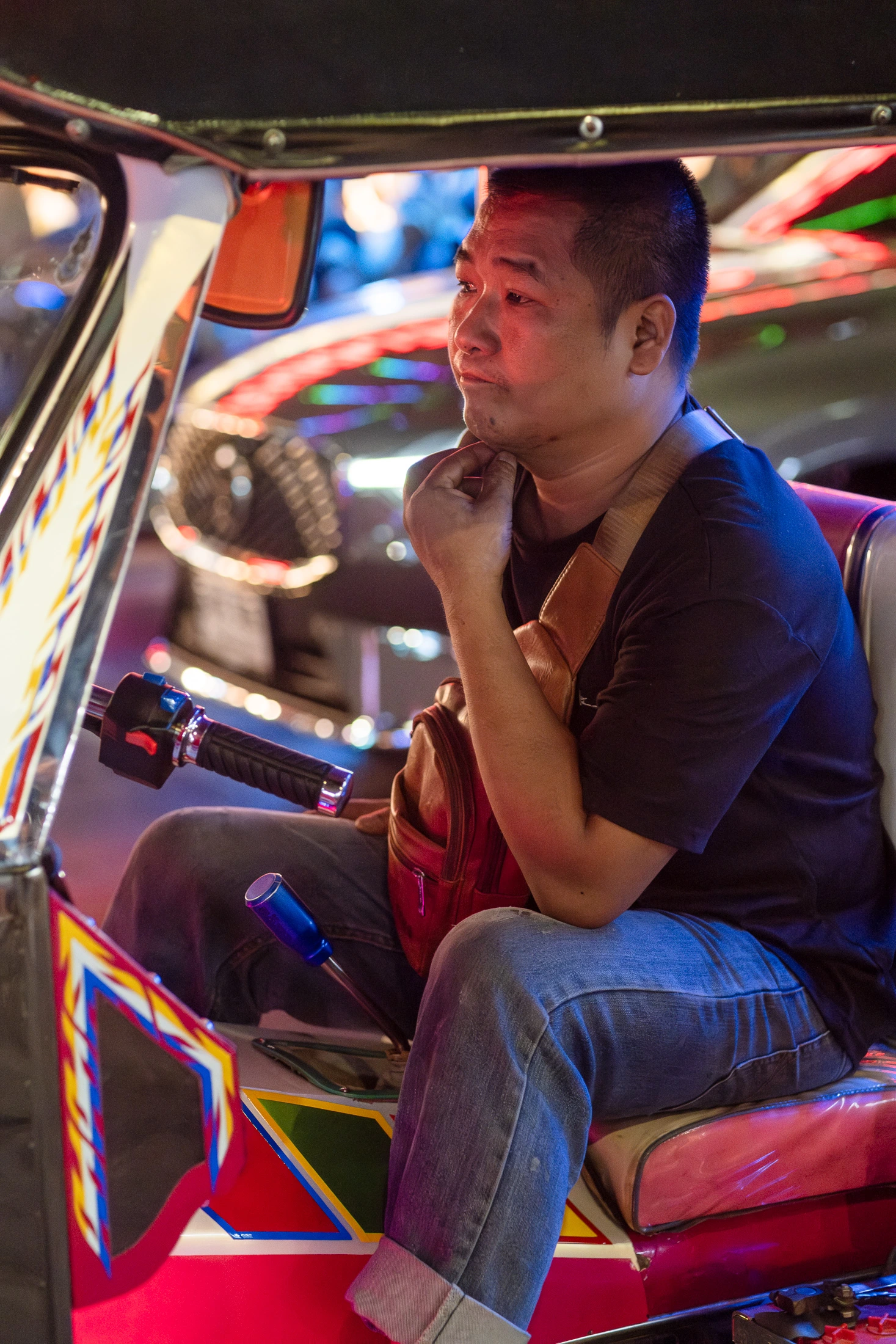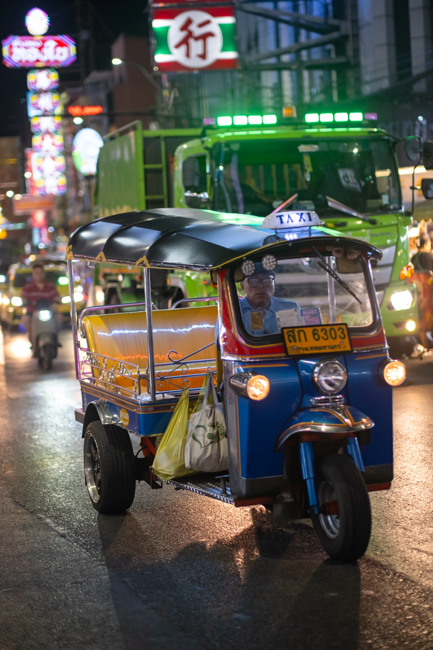 A tricycle rider making his way through dense traffic in the colourful Bangkok Chinatown.
