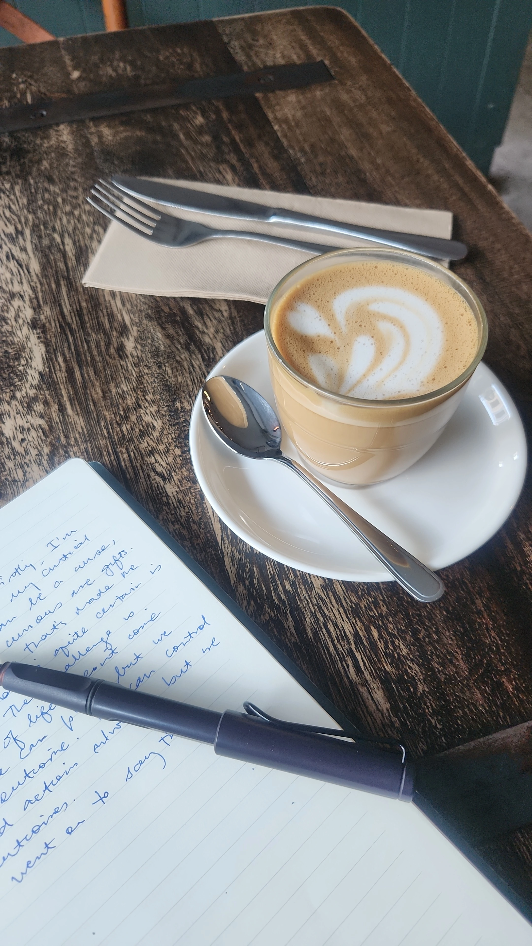 Image: A journal sits on a cafe table. We see a fountain pen resting on the page. There's a coffee in the background.